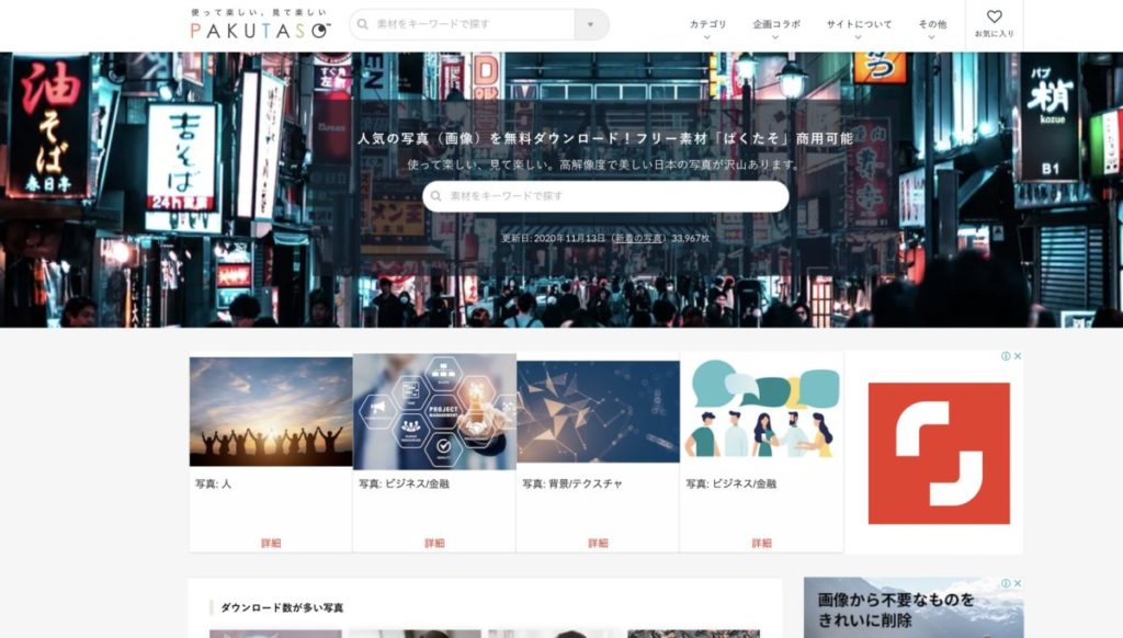 海外の画像より日本のものが使いたい!という方は「ぱくたそ」です。ブログテーマによっては、海外の画像より日本人や日本の風景がしっくりくるという方はオススメです。無料でクレジットの記事義務なしで使うことができるサイトでとてもありがたいです。特に日本人のフリー画像はないので助かります。
