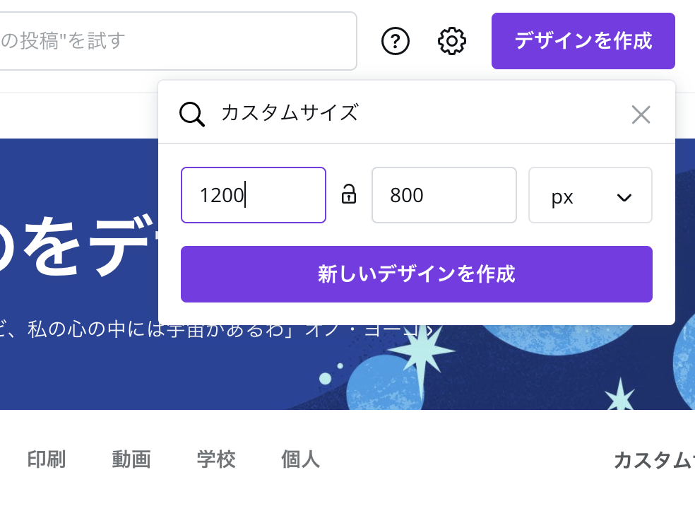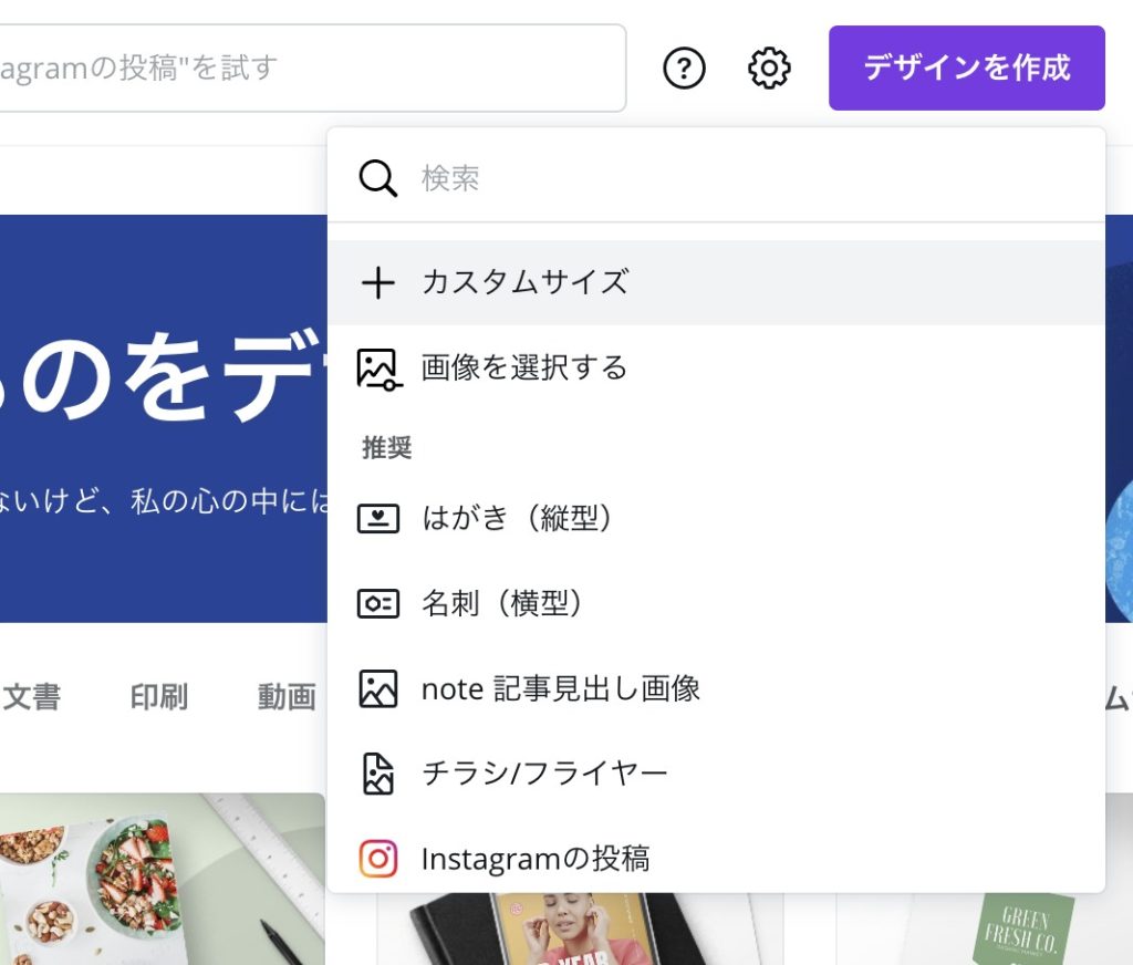 画面右上の「デザインを作成」をクリックし、「カスタムサイズ」をクリックします。